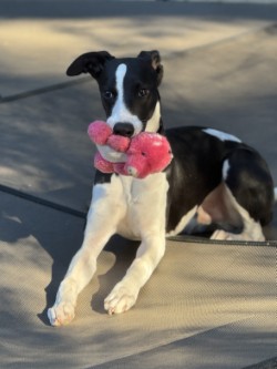 From his Foster: Goblin is a very sweet, silly, male whippet who can be a little shy in new situations and around new things – he’s still so young that lots of things are quite new! He is playing catch up after spending his early months in a pretty isolated situation. He is quick to adjust and is quite resilient when given time to assess things. He is also smart and learns quickly with positive reinforcement techniques. He loves food and loves to fetch and interact with people by bringing them a toy. He’s been lure coursing and could be a great and fun sport puppy for the right home. He is still a puppy, and will need ongoing support and training. He is close to potty trained, but mostly because I take him out frequently in a secure yard or on leash walks so he can learn good habits and to potty outside of the house. He sleeps through the night in a crate close to my bed so if he does need to go out, he will tell me.