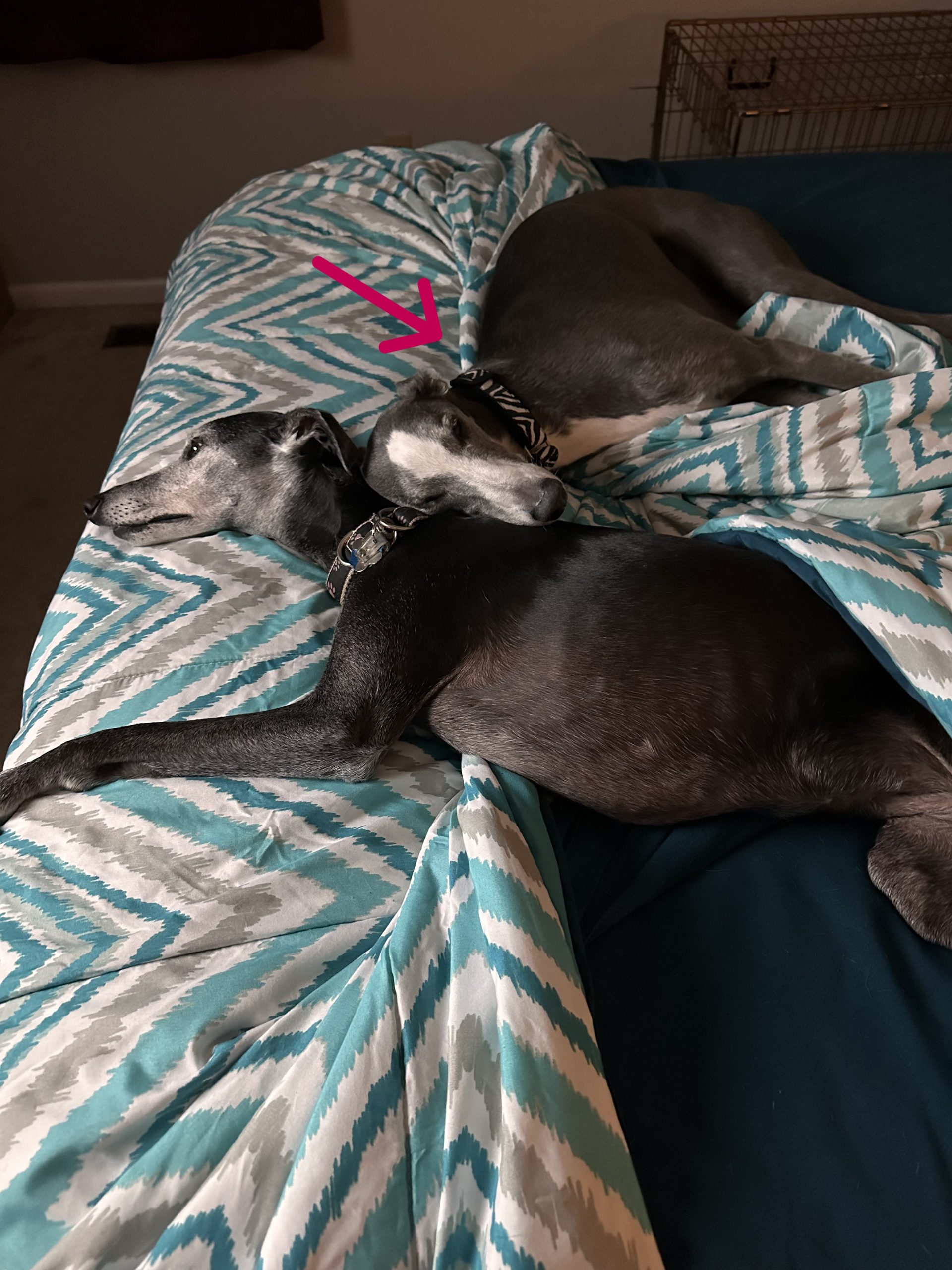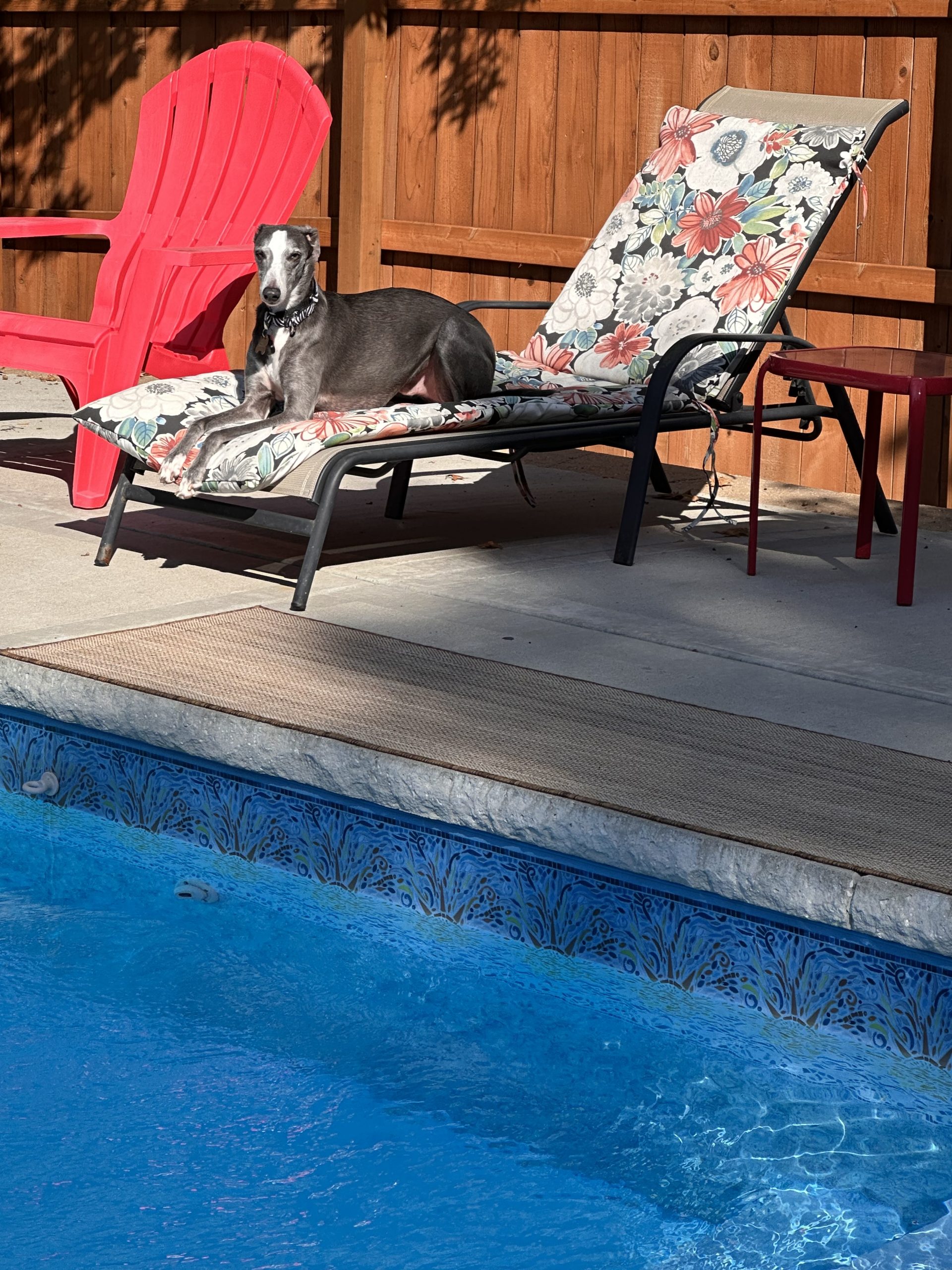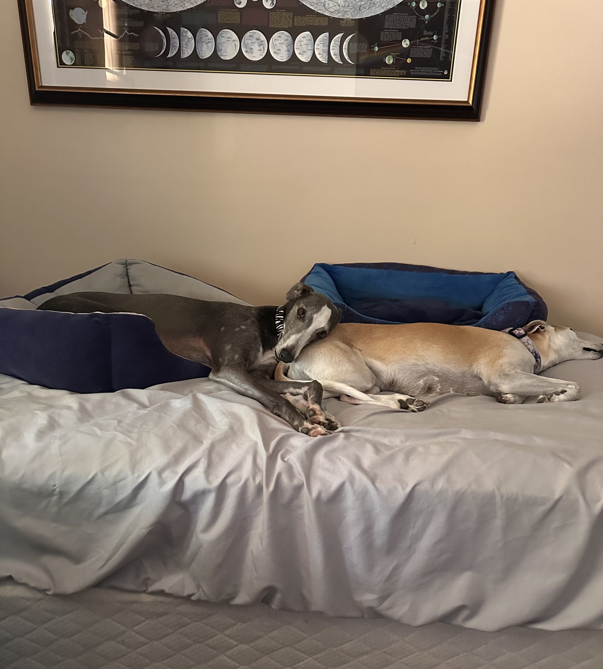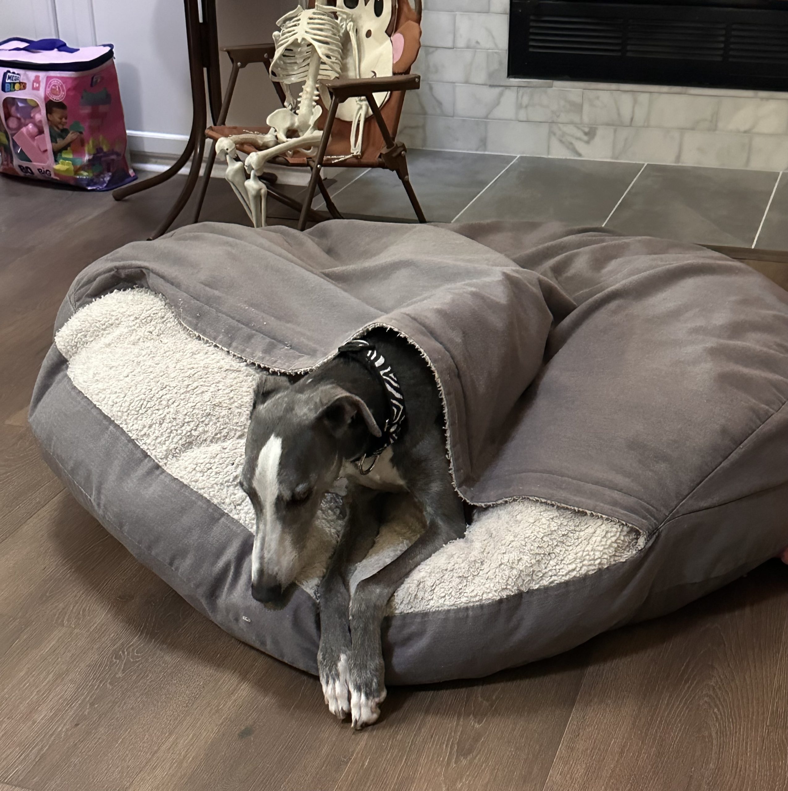 Wallace loves to be outside and has good yard manners as well. Wallace will need a 6 ft fenced yard. After a good run or two around the yard playing with toys or his whippet roommates, he loves to take a good nap in a nice soft place. He is crate trained but prefers to be out with the other whippets in the house. He is home office trained and will be there for emotional support during your workday. Wallace is well versed in sunbathing as well as people watching. Wallace will sleep in his cave bed or next to you in bed.